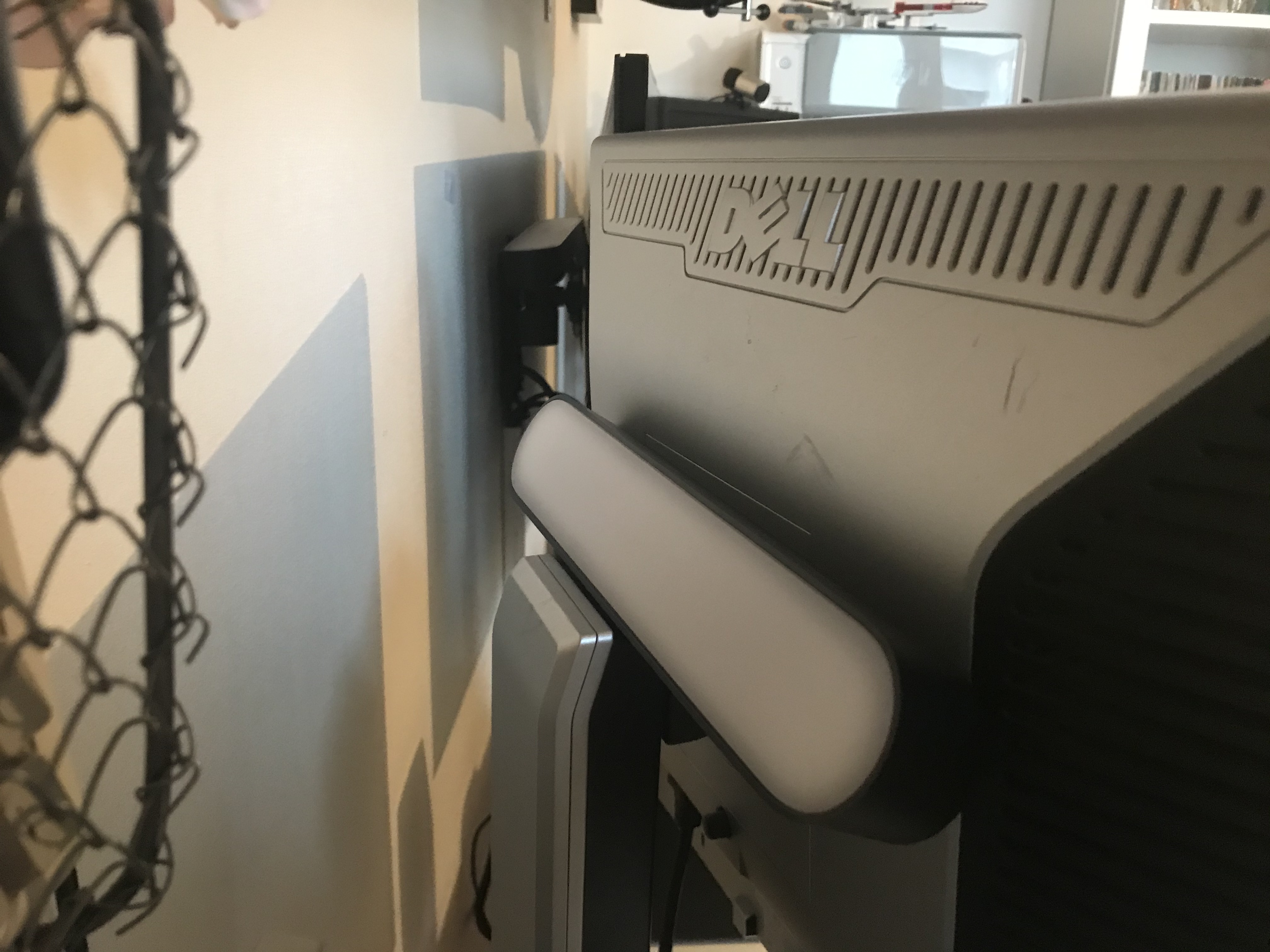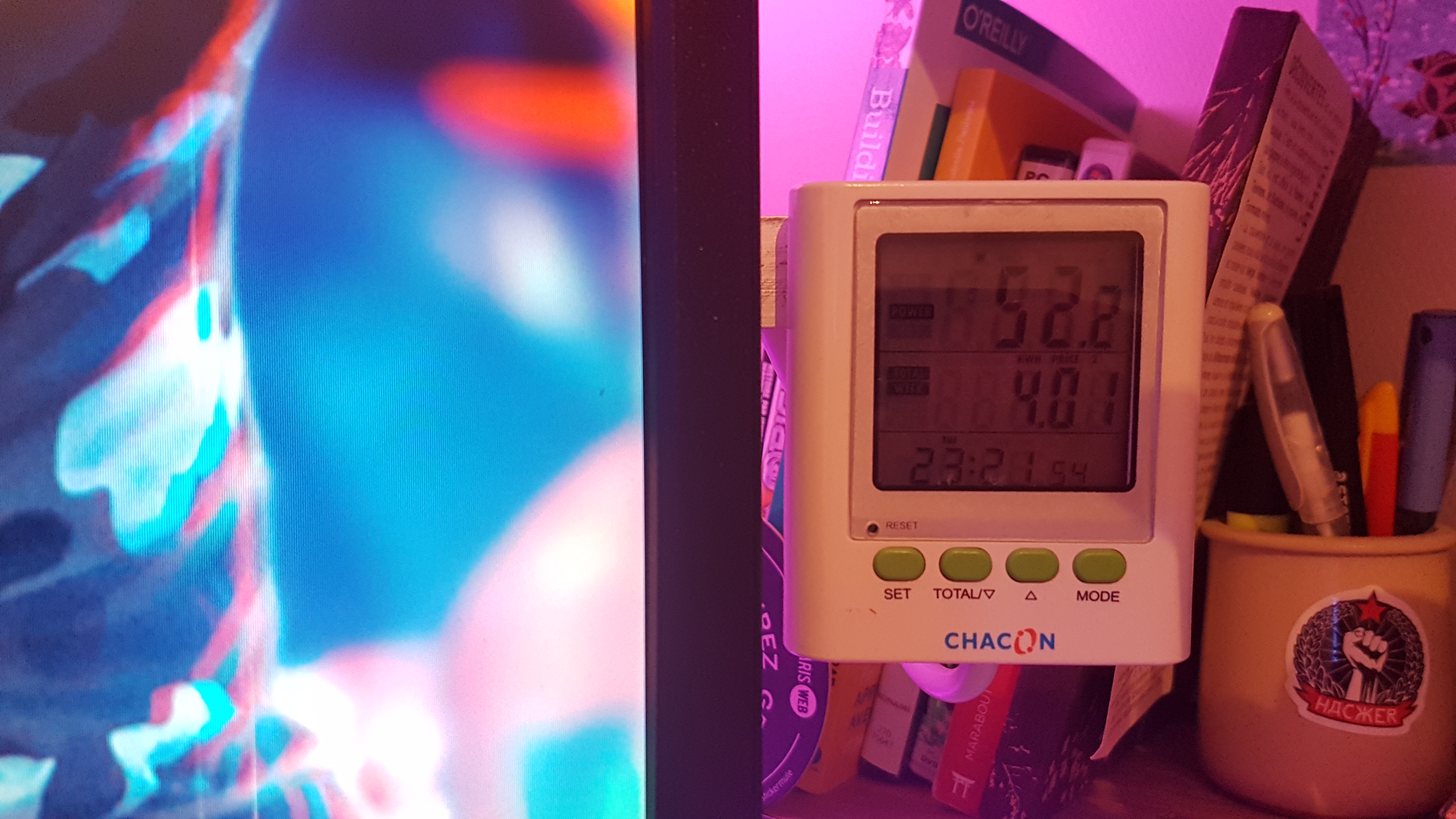Il est important de nos jours d’avoir conscience de sa consommation d’énergie, j’ai donc ajouter un wattmètre pour voir en temps réel la consommation d’énergie du setup (du mois la partie principale). Ce wattmètre a un écran déporté que j’ai accroché via un petit bricolage à 1 des bras des écrans.