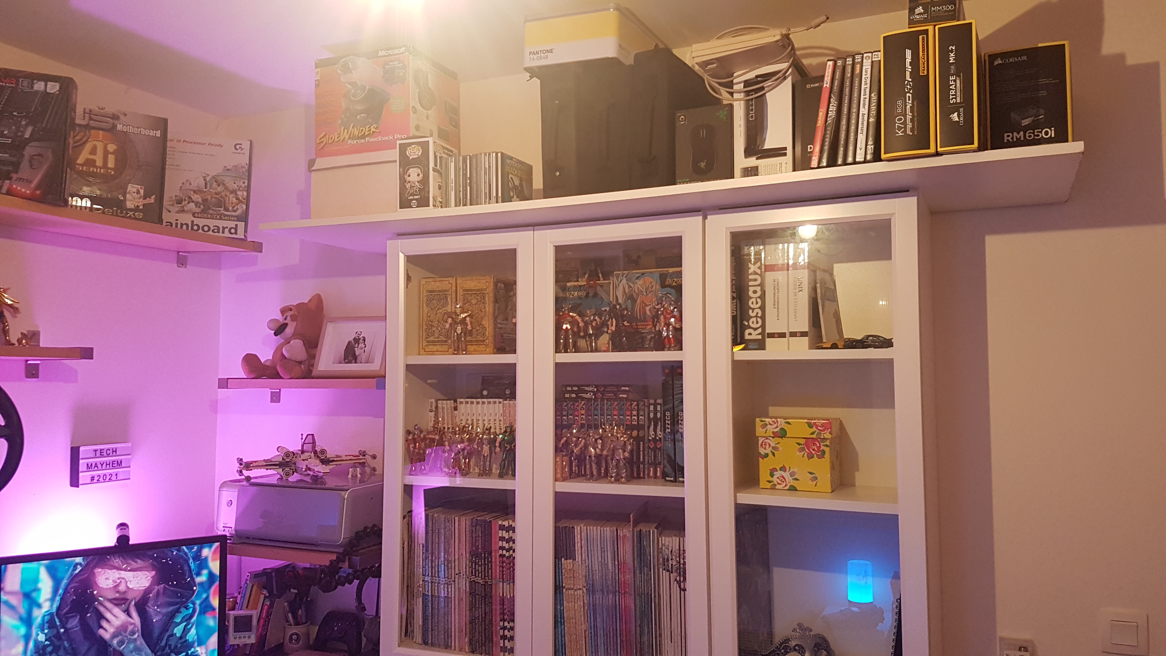 La bibliothèque à droite du bureau : mangas, figurines de chevaliers du zodiaque, magazines Joystick