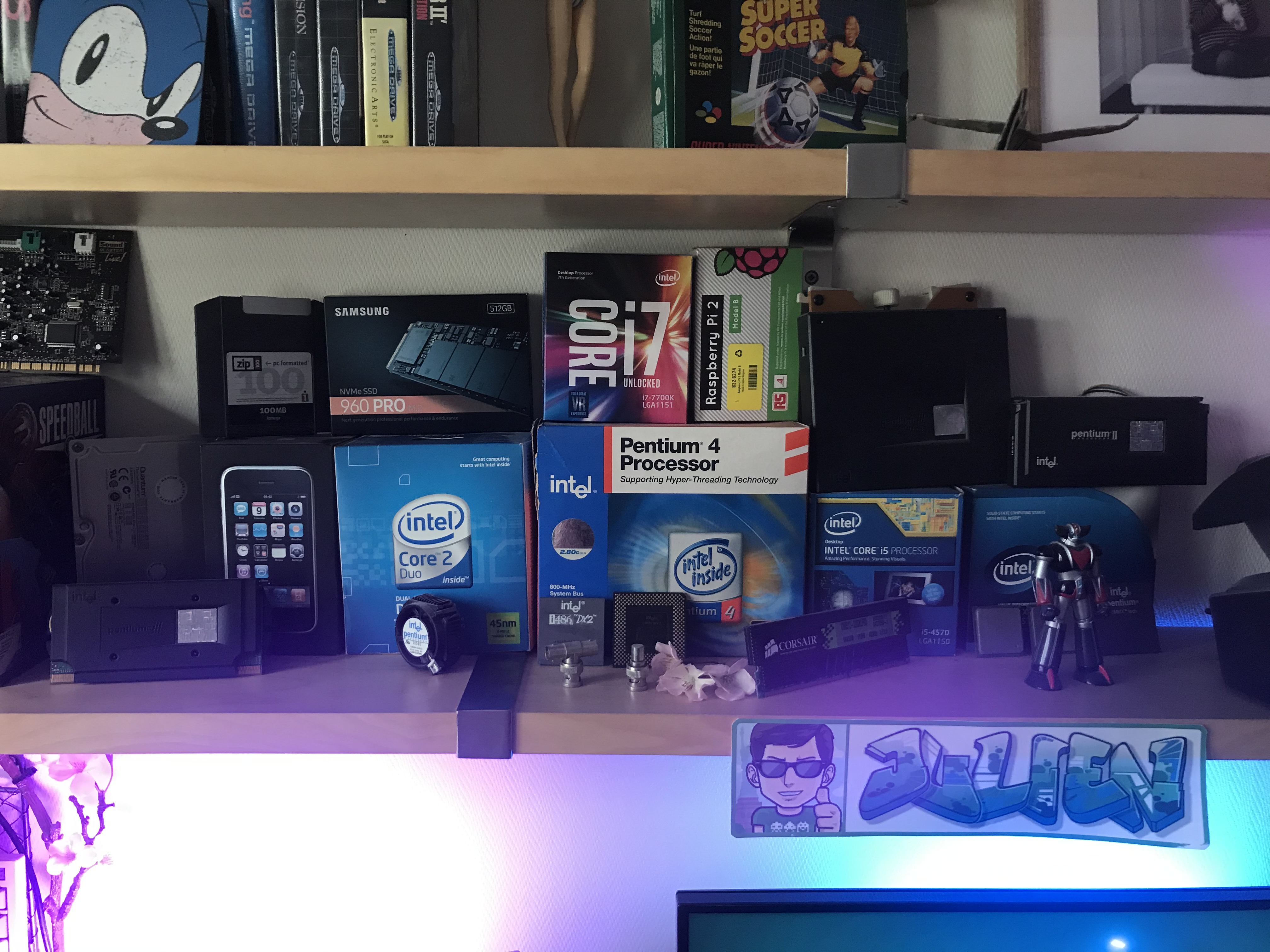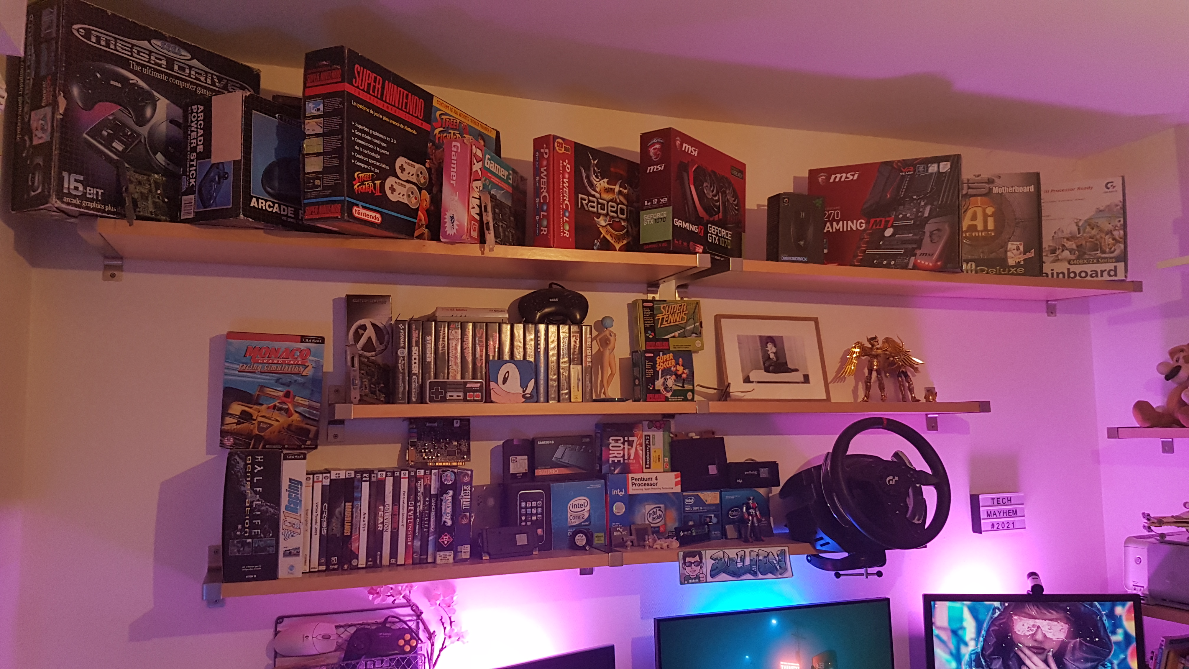 Les étagères : retro-gaming, cartes mères et boites de composants de différentes génération, jeux vidéos en dvd