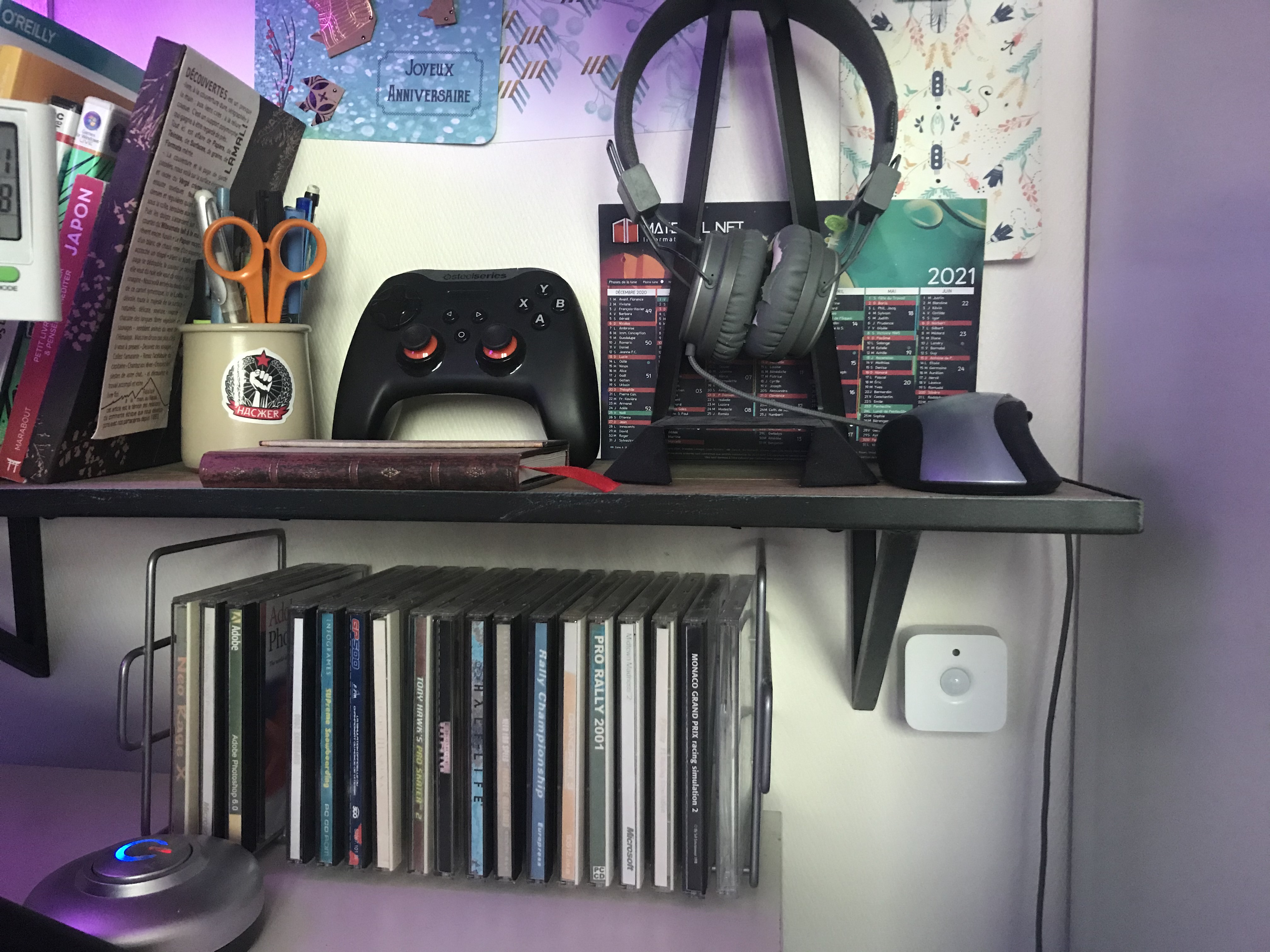 - 4 Philips Hue Play : 1 sur chaque écran (3x) et 1 sous le bureau avec pont de connexion et détecteur de présence